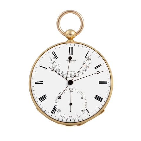 Caliber 39 mm, hinged, gilt brass full plate with turned pillars, fusee and chain, verge escapement with micrometric potence adjustment, plain brass three-arm balance, flat balance spring, continental cock with polished steel endplate, silvered regulation dial.