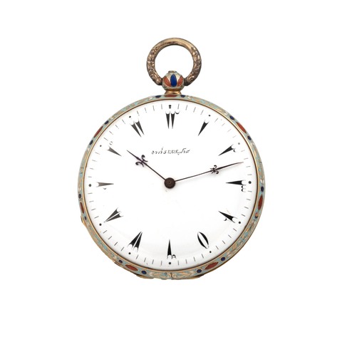 A very fine and rare, 18k gold and enamel, manual wind open face keyless pocket watch. Protecting case with scalloped edges case, bezels decorated with pale green and pink enamel, red and white enamel stylized flower heads. central medaillon painted with a harbor scene with fully rigged ships and lighthouse under a pale rose sky. White enamel dial, Islamic numerals, minute track and Islamic five-minute numerals. Steel hands.