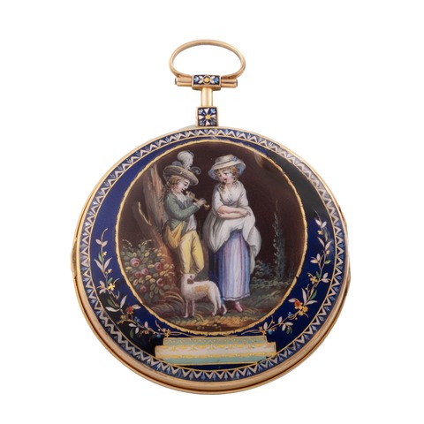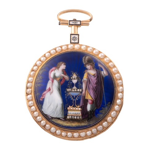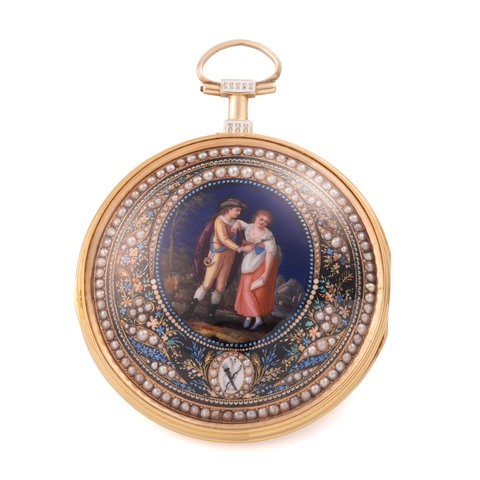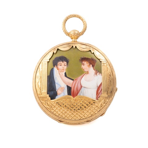A very fine, rare and elegant, 18k yellow gold, manual wind open-face, key-winding, pocket watch. Case-back with a scene showing a couple of young people, the young man wearing a plumed helmet, a yellow tunic, a purple cape and black boots, the young woman dressed in long white dress and a pink shawl her hair styled up. She seems to be looking intently at the young man. The urne between the two figures is large anf decorated with stones. White enamel dial with radial Arabic numerals, gold hands.Grading System: AAA