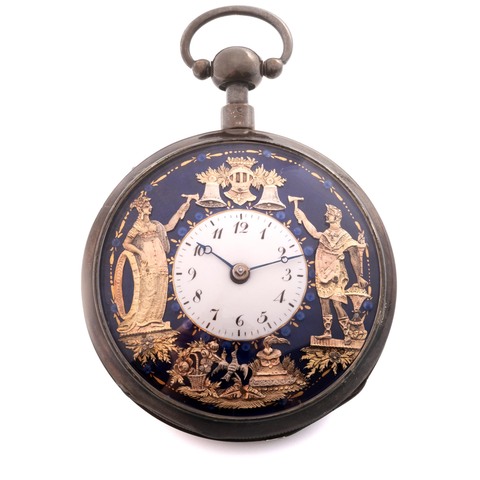 A fine, silver, manual wind open face, key-winding pocket watch, quarter repeating with automaton Jacks applied over midnight blue enamel.Grading System: A