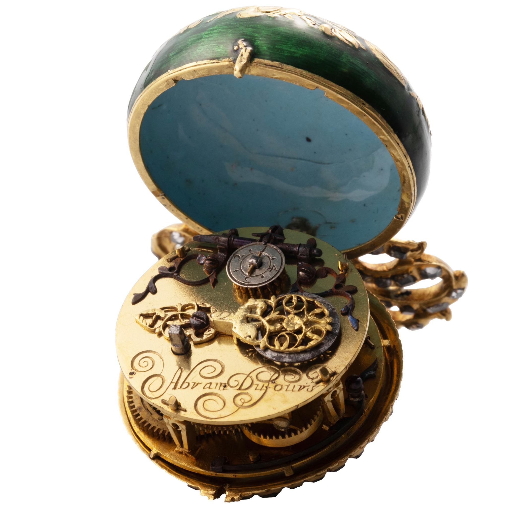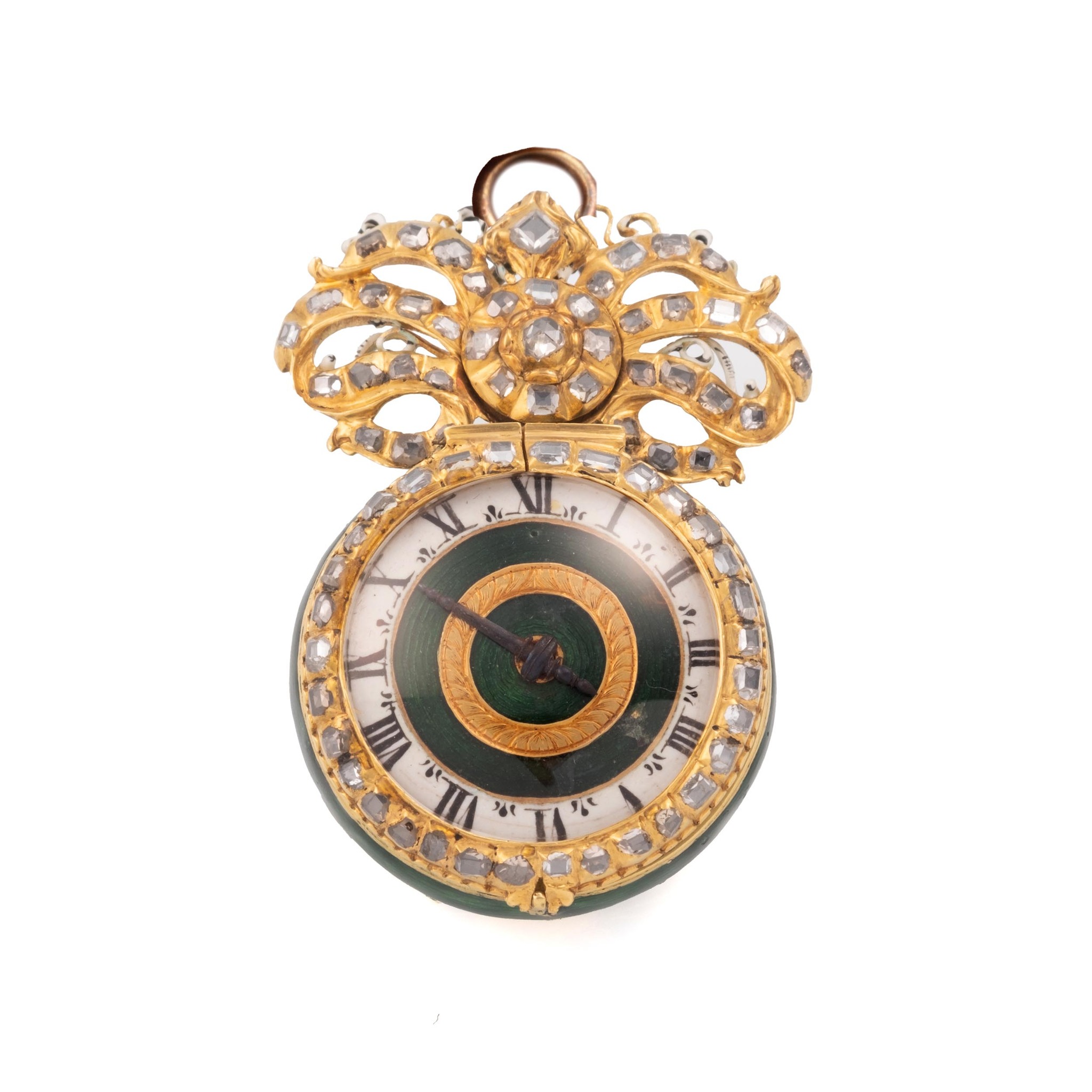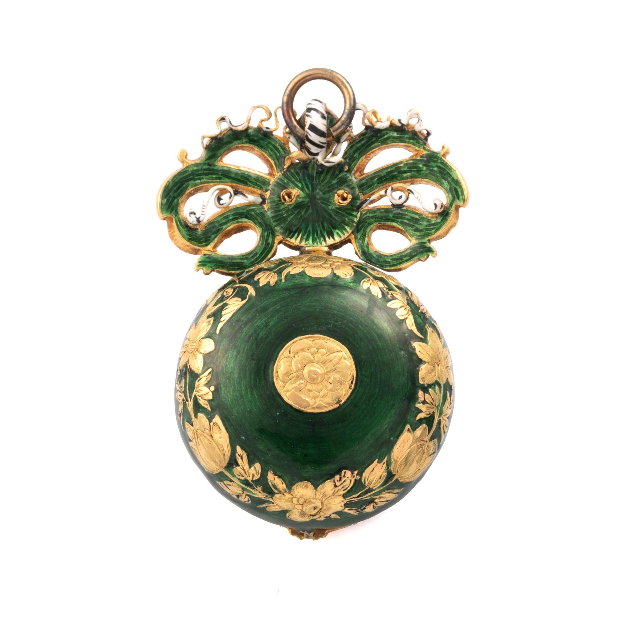An exceptionally fine and equally rare, 20k gold and enamel, manual wind open-face, key-winding pendant watch. The case overlaid with deep green basse taille enamel and a band of chased and engraved gold flowers and leaves in relief, the center with a chased and engraved flower rosette, light blue counter enamel, cut hinged bezel set with 32 irregular cut diamonds in rub-over settings, ribbon form pendant mount set with 42 irregular cut diamonds in rub-over settings, the reverse enameled to match the case and with white and black pendant loop and small additional ribbons enamelled Ronde bosse. Gold dial with white enamel annular chapter ring with small radial Roman numerals and half-hour markers, the center with concentric rings of basse taille enamel to match the case, intersected by a chased and engraved gold ring with stiff-leaf decoration. Steel single hand.