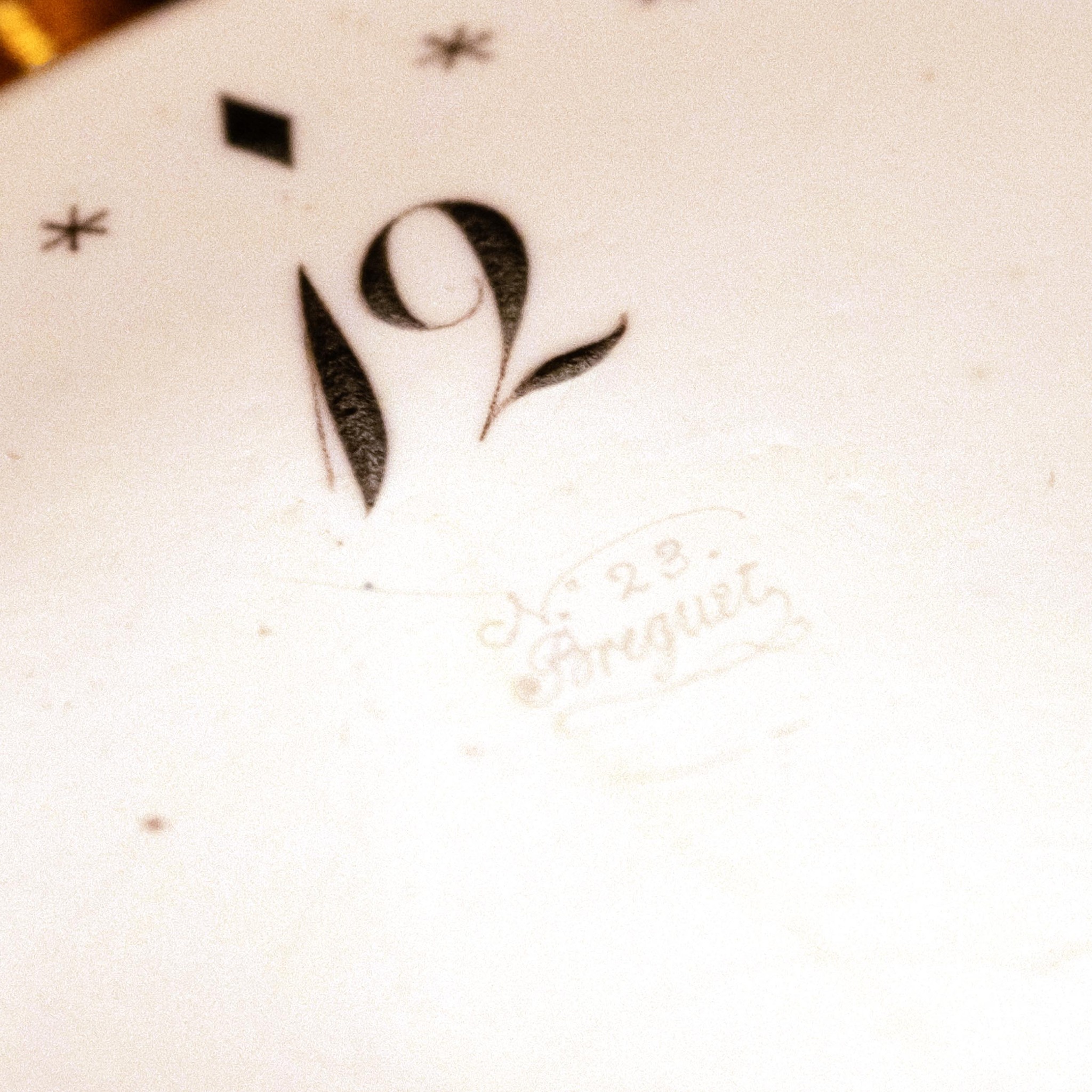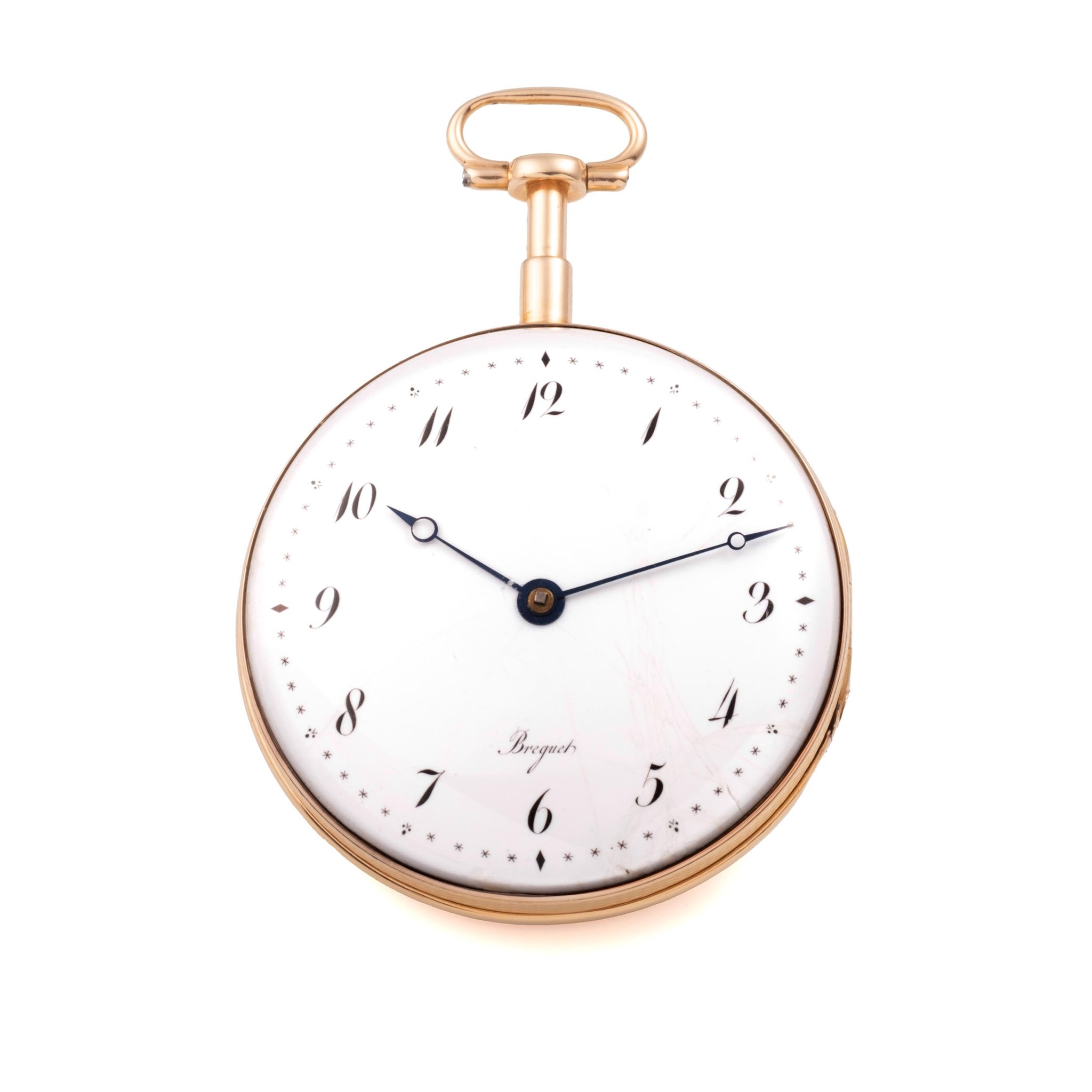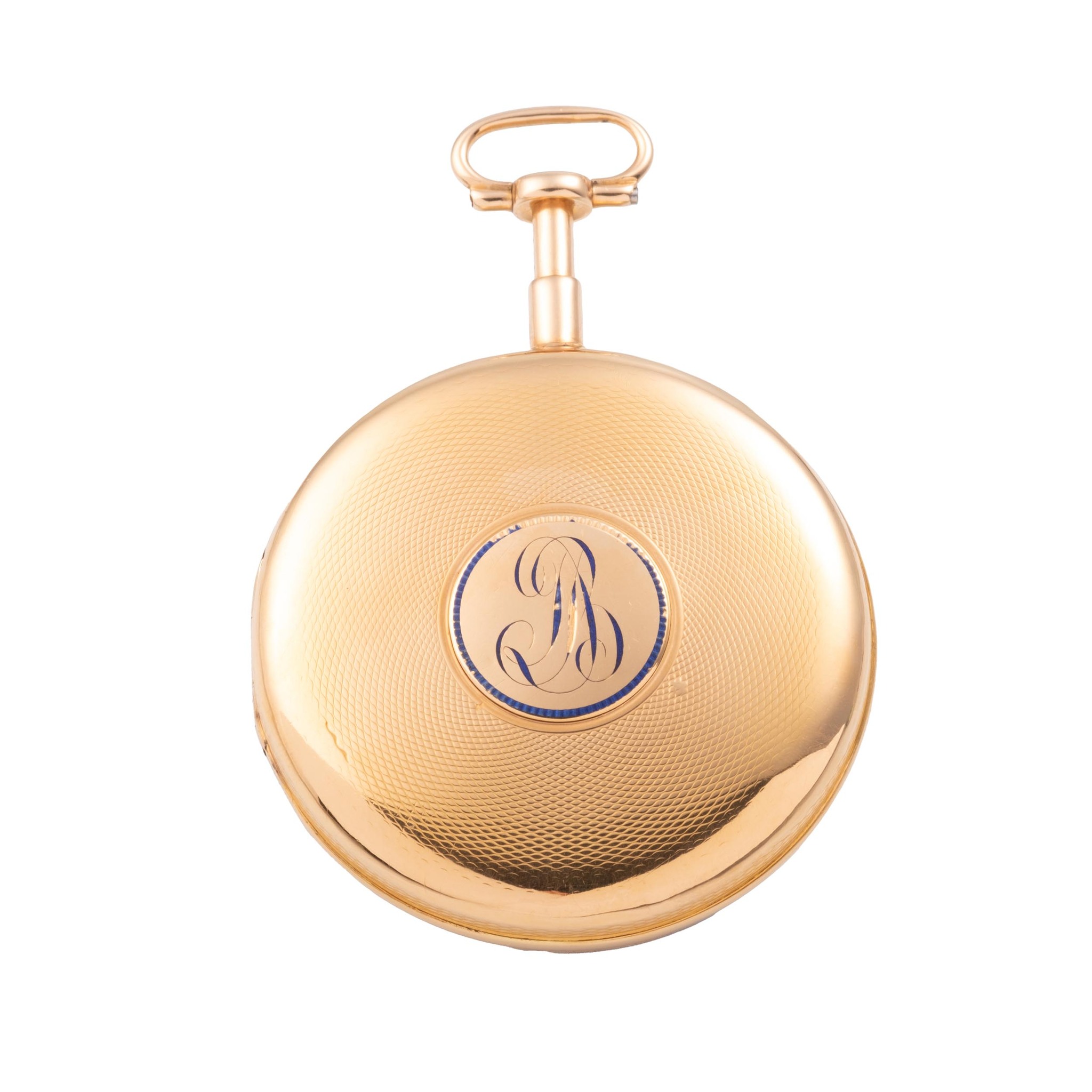 An extremely fine and extremely rare, 20k gold, manual wind open-face key-winding, early type case by Guillaume Mermillod (master mark), engine-turned, the back with central applied gold disc decorated with a blue enamel monogram, concealed hinge. Gilt brass dust cover. Five minute repeater (a toc), Lépine caliber, standing barrel, overhanging ruby cylinder escapement. White enamel by F. Cave, Pl. Thionu, Breguet numerals, outer star minute indexes and lozenge quarter-hour indexes, secret signature. Blued steel Breguet hands