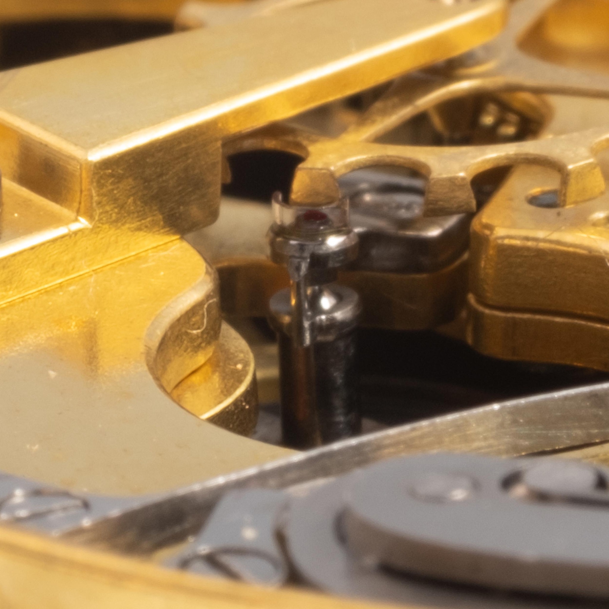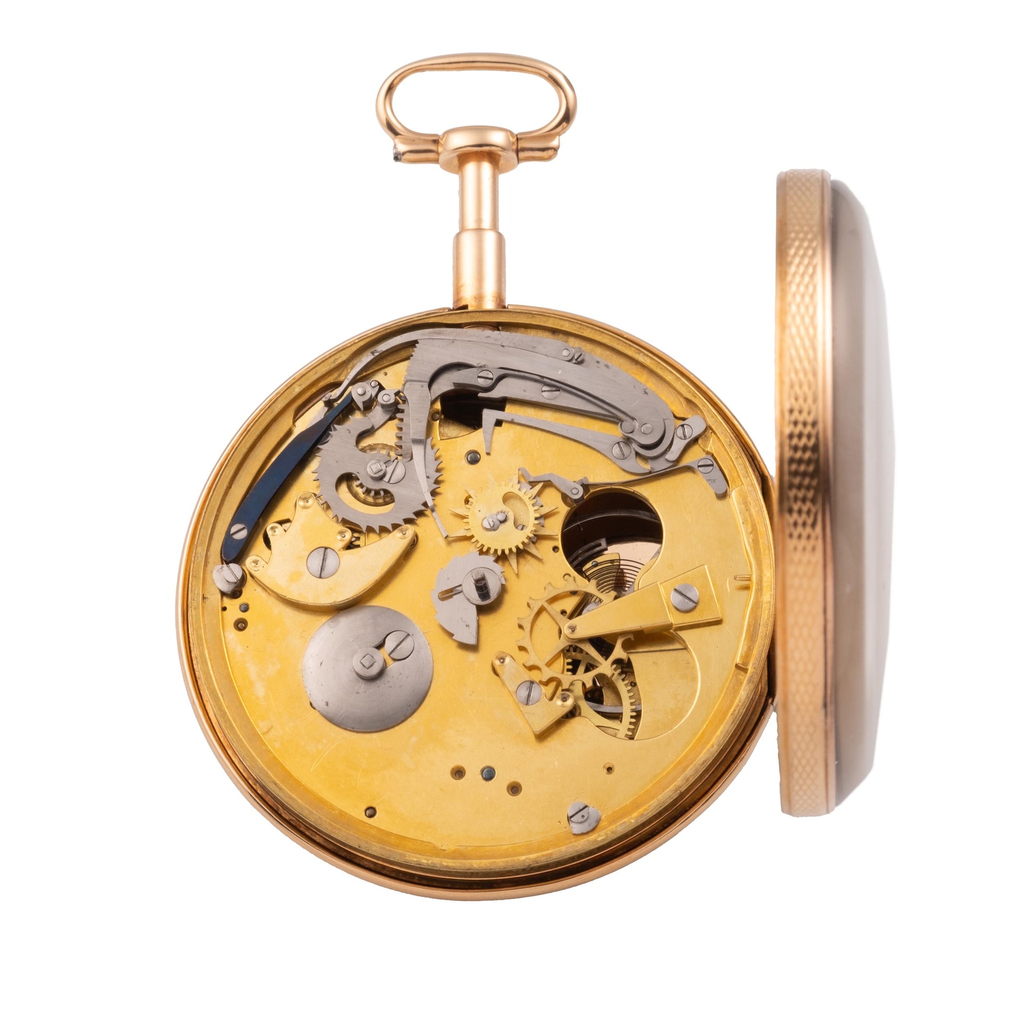 Caliber 48 mm., gilt, Lépine caliber, standing barrel, overhanging ruby cylinder escapement, plain three-arm steel balance with parachute on the top pivot, blued steel flat balance spring, index regulator with bimetallic temperature compensation curb, all-or-nothing repeating with a single hammer on the side of the case activated by depressing the pendant.