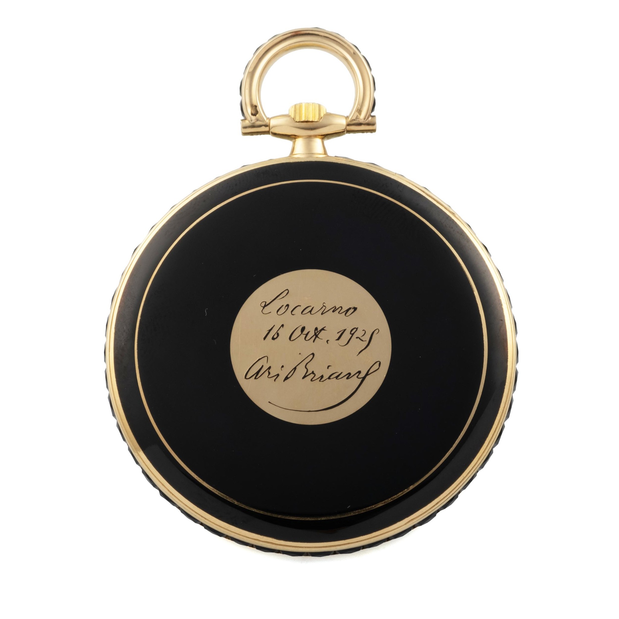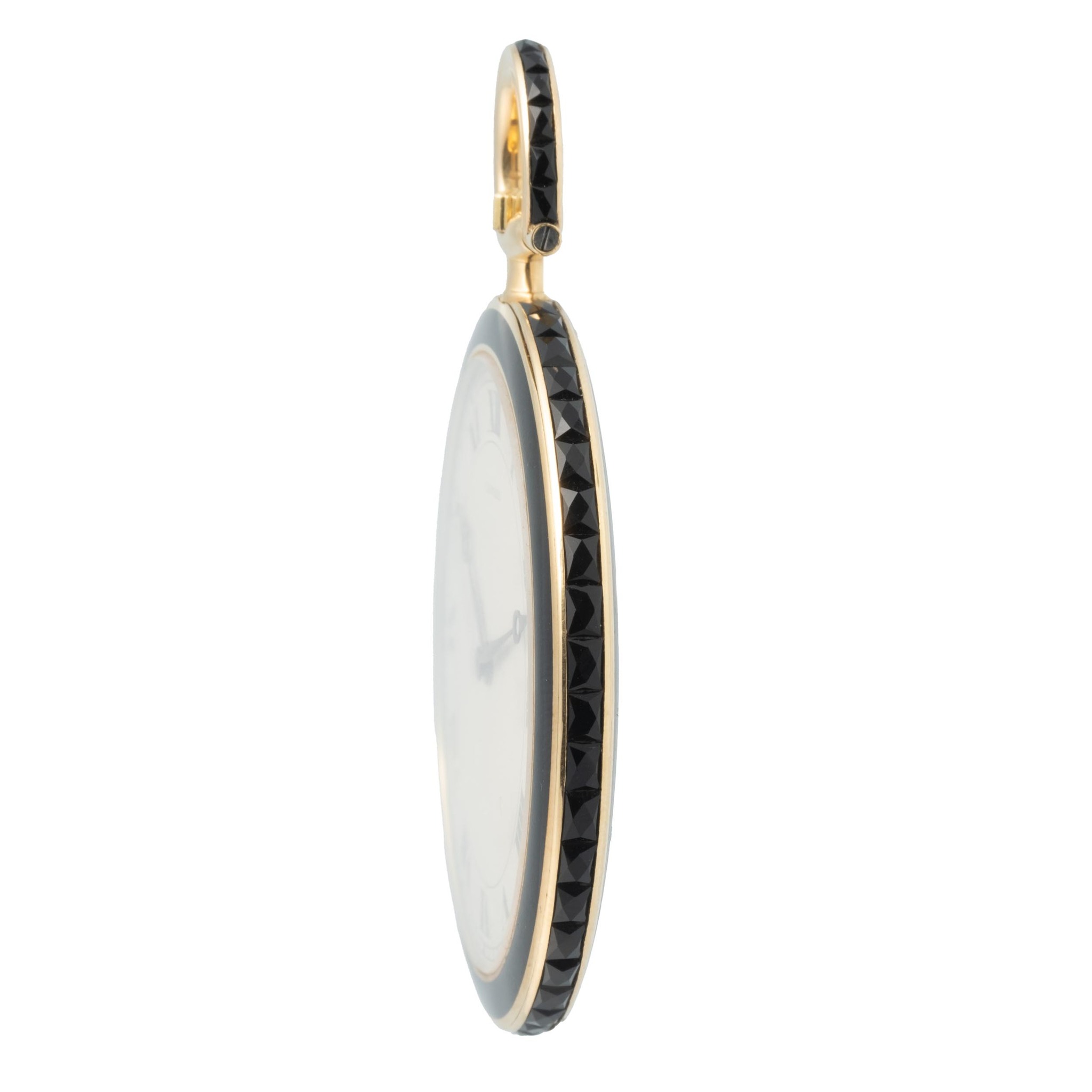 A fine, unique, historical, 18k yellow gold, manual wind black lacquer and gold pocket watch set with black diamonds