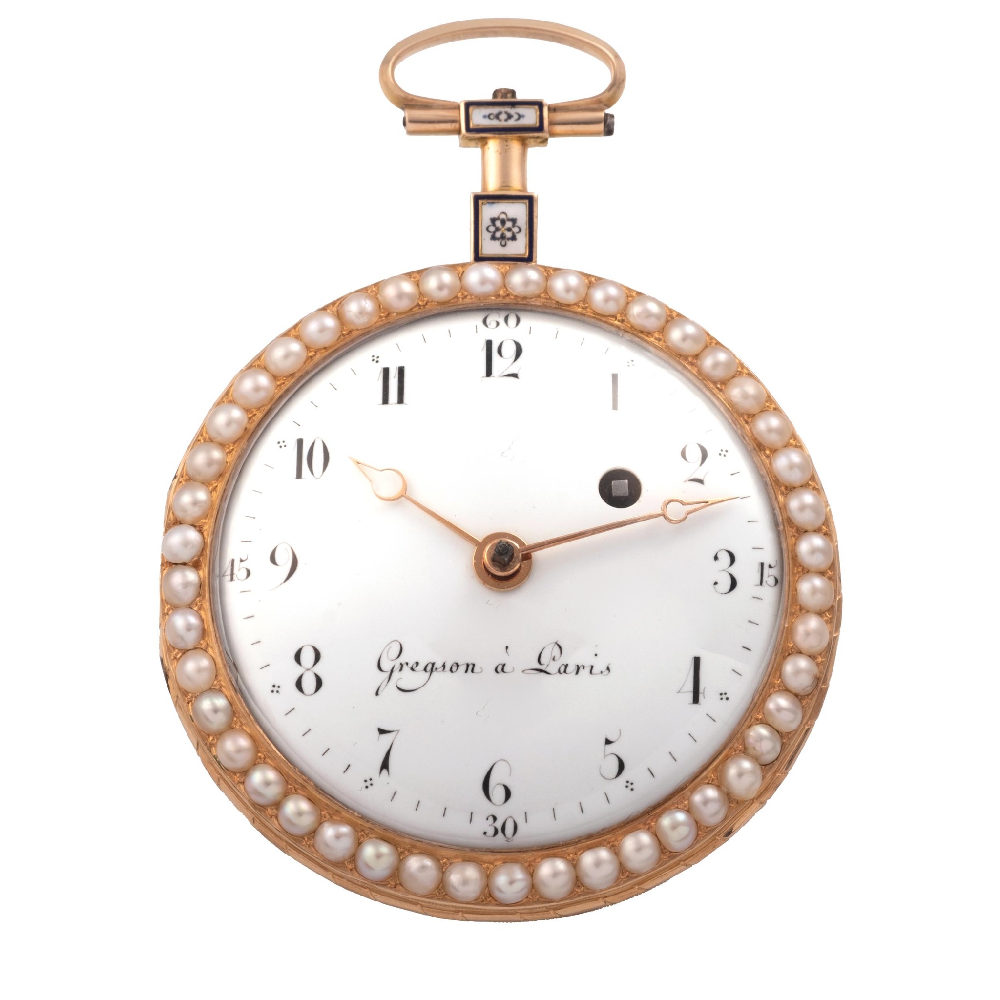 GREGSON, SWITZERLAND, DECORATIVE POCKET WATCH WITH PAINTED ON ENAMEL CASE BACK AND PEARLS SET, 18K YELLOW GOLD